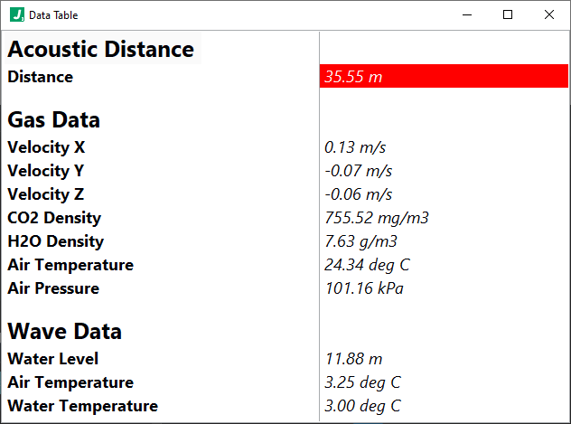 The ability to dynamically update the cell background and text colors allows the table to act as an alarm interface as well. For example, you may make the background color of a cell red when a value exceeds a specified threshold, as shown above. Many other attributes of the table can be configured, such as row/col headers, whether to show scrollbars, whether to display vertical/horizontal lines, or whether to autosize row heights to display multiline content.